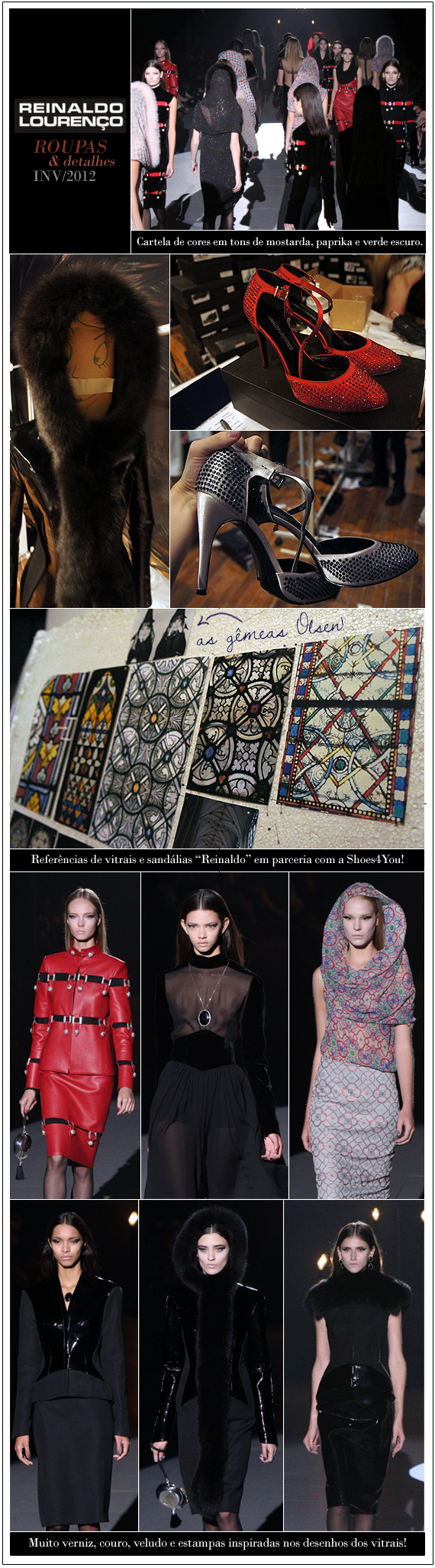 Reinaldo maravilhoso também!!!! Adorei as tachinhas nos sapatos a gola ''peludinha'', o couro, o veludo e o plush, gente veludo tá muito em alta né?! Achei legal a inspiração nos vitrais e gostei também dos acessórios como os brincos e colares de pedra preta.